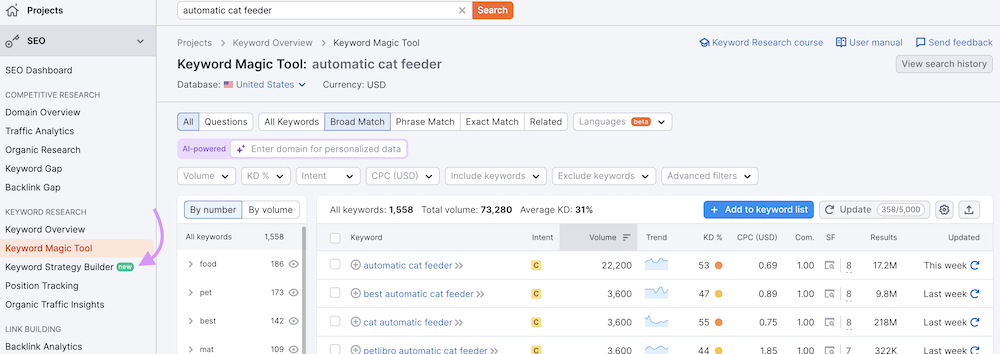 "automatic cat feeder" seed keyword entered into the Keyword Magic Tool