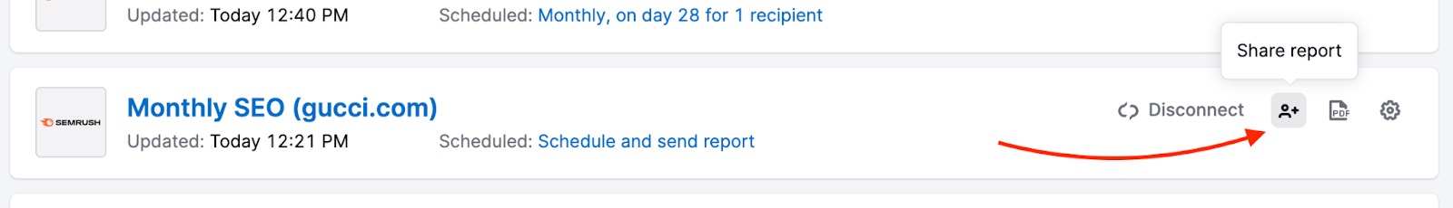 In the various tools and reports in Semrush, there are ways to share your research and work within a team.